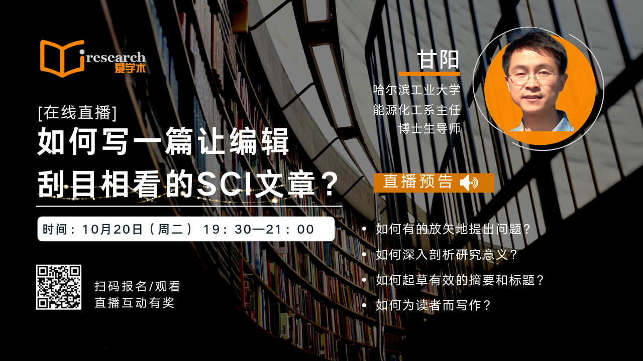 本期直播,爱学术邀请哈尔滨工业大学的甘阳教授,以SCI期刊编辑的角度,为大家讲解发表SCI论文的入门技巧。直播期间我们还有礼品抽奖等活动,欢迎大家积极参与。现在起,您可通过链接http://live.vhall.com/568599915,报名直播,保留日期,届时观看。直播时间:10月20日 周二 19:30-21:00
